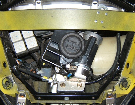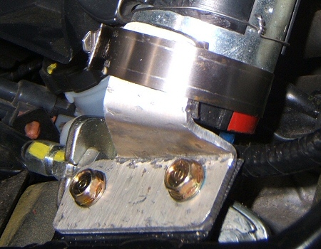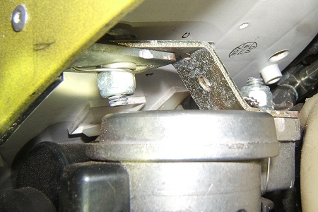 I put a piece of protective foam on the underside of the bottom bracket where it contacts the horn's compressor, and secured them with a stainless steel hose clamp (Figures 6, 7). The horn now has no free play, and doesn't impinge on any other parts.