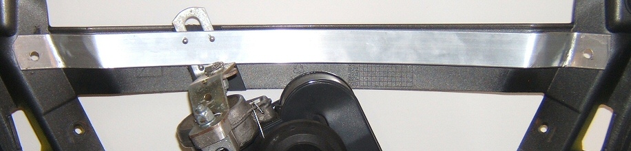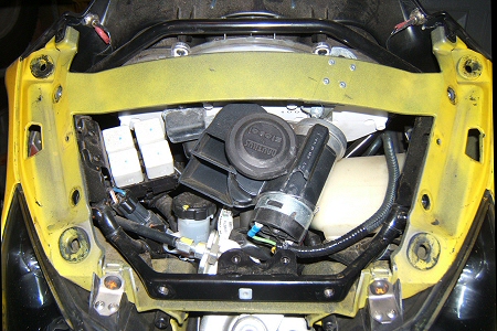 | Stebel Nautilus Installation on an MP3 400 Finding space for an air horn on the front end of the MP3 is a challenge, mostly because of the tilt mechanism. I had to relocate my Stebel twice because what had seemed like safe spots when the bike was upright, turned out to be in the way of suspension components while leaning. I finally settled on the area behind the front cover (the black plastic behind the windshield), just below the instrument cluster. The shield (the main body of the front fairing) has a band running across the top. This is a convenient mounting place, but the thin plastic is not strong enough to support an air horn in a dynamic environment. I reinforced it with sheet aluminum (Figure 1) that attaches to existing mounting nuts on either side. The upper bracket assembly (Figure 2) is riveted though both the metal reinforcing strip and the plastic in front of it (Figure 3, upper right).